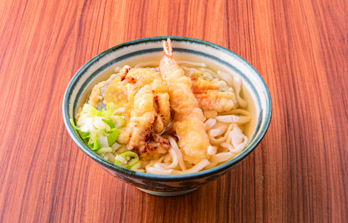 当店の特注うどんは、もちもちとした食感とコシが自慢です。昆布とあご(飛び魚)の旨味が詰まった特製だしで、風味豊かな味わいをお楽しみいただけます。さらに、店舗で丁寧に仕込んだ揚げたての天ぷらをのせた天ぷらうどんは、サクサクの食感とだしの相性が抜群です。こだわりの素材と技で作り上げた、心温まる一杯をぜひご堪能ください。